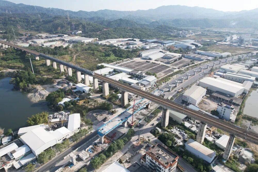 粤东城际铁路地都站至桑浦山站特大桥连续梁顺利合龙,并成功下穿运营中的杭深铁路榕江特大桥,为后续架梁、铺轨奠定基础。